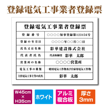 ¥14,800¥17,412単価 /利用不可登録電気工事業登録票 看板 アルミ複合板 W45cm×H35cm / 白看板+黒文字 法定看板 事務所 店舗 不動産 法令許可票 ele-alumi