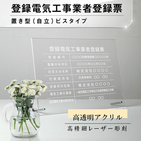 ¥11,000¥12,941単価 /利用不可登録電気工事 看板【透明アクリル板/置き型 自立】高精細 レーザー彫刻 加工 業者票 看板 事務所用 gs-pl-ele-standt