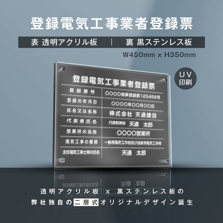¥11,000¥12,941単価 /利用不可登録電気工事 看板【黒ステンレス×アクリル板】W450mm×H350mm 許可票 事務所 gs-pl-ele-t-black