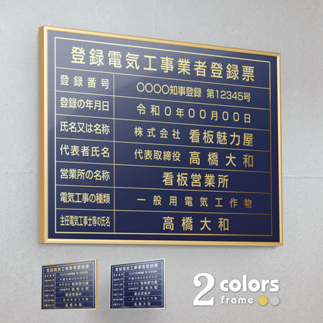 下限 ¥9,800¥11,529単価 /利用不可登録電気工事 看板 業者票 看板 高級 許可票 法令 カラー:紺色 金/銀文字 事務所用 標識 サイン gs-pl-navy-ele