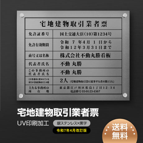¥12,700単価 /利用不可宅地建物取引業者票 宅建 標識 不動産 業者票 銀ステンレス板×黒文字 化粧ビス 許可票 tr-sil-stl-blk