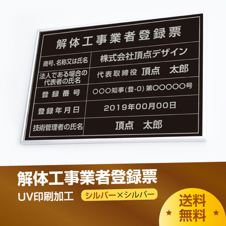 解体工事業者登録票 看板 業者票 黒看板×銀文字 【内容印刷込み】 kaitai-sil-sil-blk
