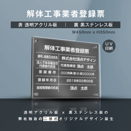 ¥10,000単価 /利用不可解体工事業者登録票 看板 業者票 事務所【黒ステンレス×アクリル板】gs-pl-kaitai-t-black