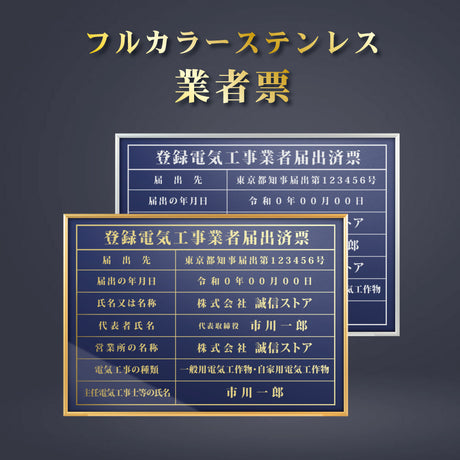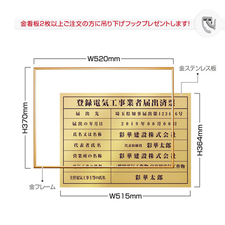 ¥6,220単価 /利用不可日本製 [金看板]登録電気工事業者届出済票 ゴールド W520mmcm×H370mm ステンレス 錆びない gs-pl-kin4