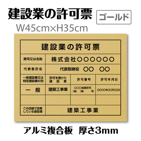 ¥10,000単価 /利用不可建設業の許可票 看板 業者票 ゴールド看板×黒文字 【内容印刷込み】pl-gold
