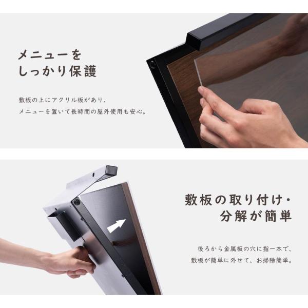 【2種類の横型メニューに対応】メニューやペンなどの落下防止スットパーが付いています。落下することなく安心して利用ができます。敷板の上にアクリル板があり、メニューを置いて長時間の屋外使用も安心。後ろから金属板の穴に指一本で、敷板が簡単に外せて、お掃除簡単。