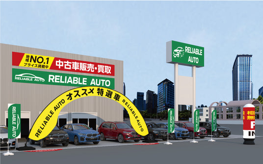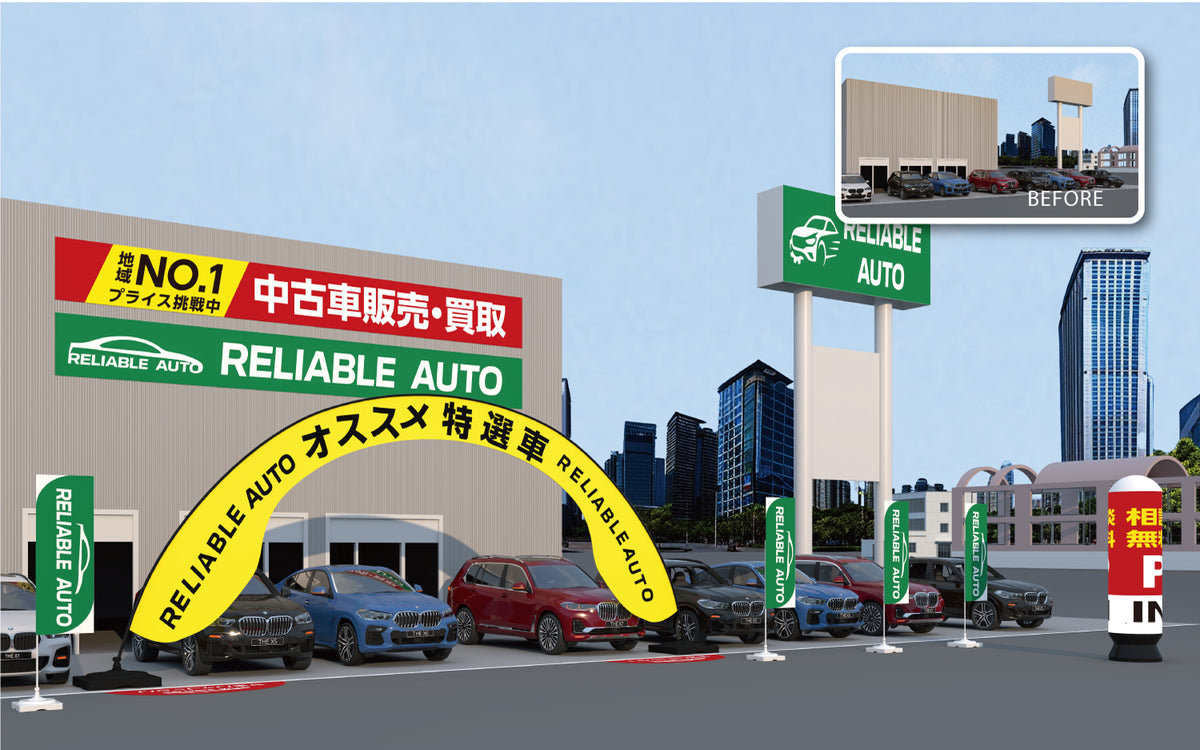 中古車販売店において店舗装飾は、第一印象を左右する重要な要素です。