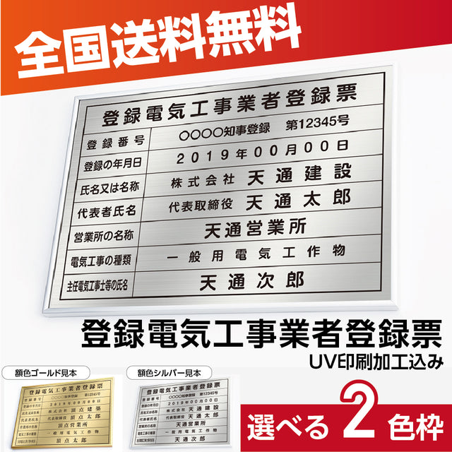 登録電気工事業者登録票 額縁 看板 UV印刷 W52cm×H37cm 銀/金 法定サイズ 業者票 許可書 事務所 法定看板 標識 額縁 kin05 - 追加しない ...は取り寄せ中で入荷次第発送します。