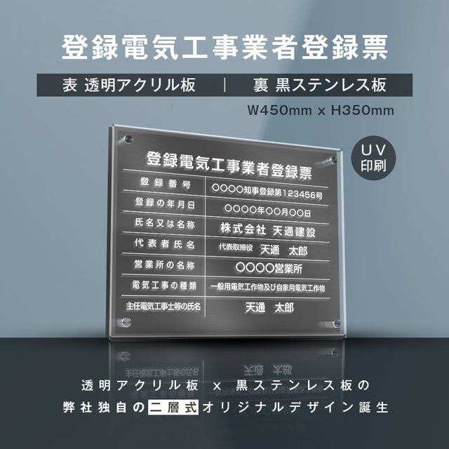登録電気工事 看板【黒ステンレス×アクリル板】W450mm×H350mm 許可票 事務所 gs-pl-ele-t-black