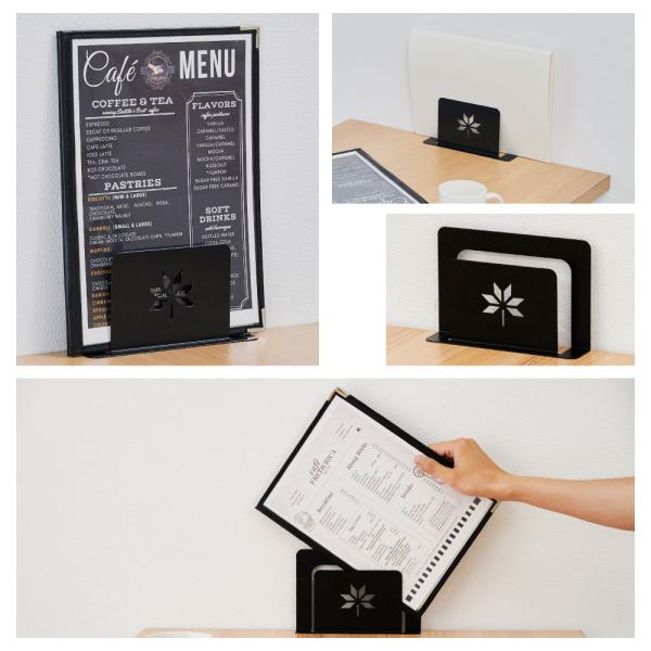 【シンプルなデザイン】ブラックスチールのメニューブックスタンド。 卓上の雰囲気をスタイリッシュに演出するメニュー立てです。マットブラックの表面塗装により卓上で主張しすぎず、メッキとは違った落ち着いた雰囲気を醸し出します。