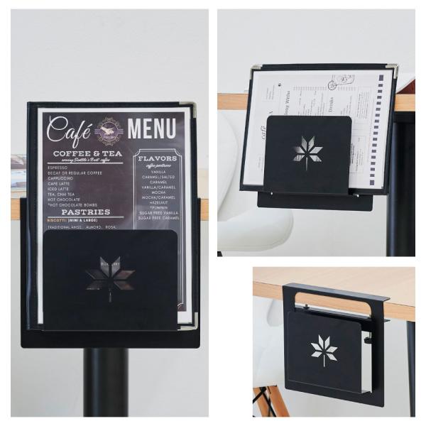 【シンプルなデザイン】ブラックスチールのメニューブックスタンド。 卓上の雰囲気をスタイリッシュに演出するメニュー立てです。マットブラックの表面塗装により卓上で主張しすぎず、メッキとは違った落ち着いた雰囲気を醸し出します。