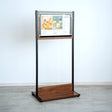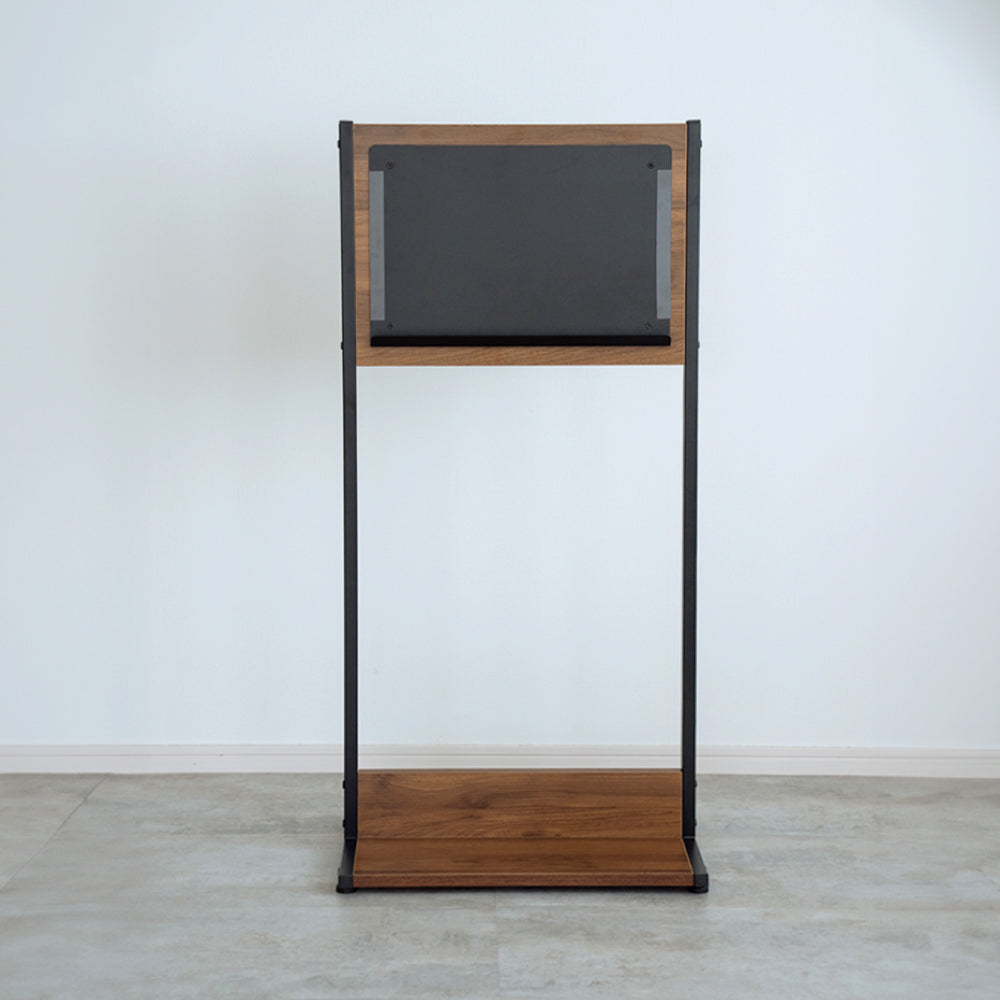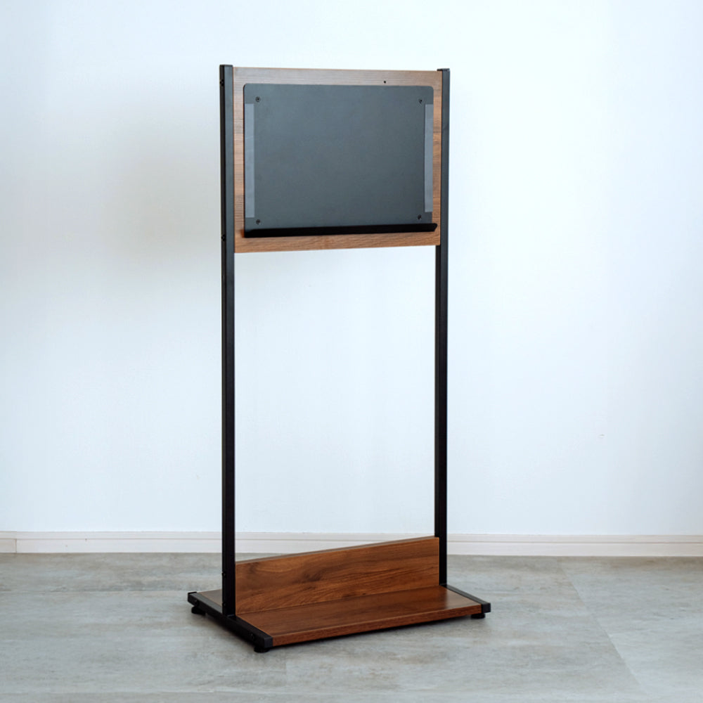 - 木目のテクスチャが引き立つ、無駄のない洗練されたデザインのメニュースタンド。店頭やエントランスにA3サイズのメニューや冊子を美しく掲示できます。板面の取り付け角度は日本人の平均身長で見やすい65度で固定されています