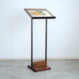 - 木目のテクスチャが引き立つ、無駄のない洗練されたデザインのメニュースタンド。店頭やエントランスにA3サイズのメニューや冊子を美しく掲示できます。板面の取り付け角度は日本人の平均身長で見やすい65度で固定されています