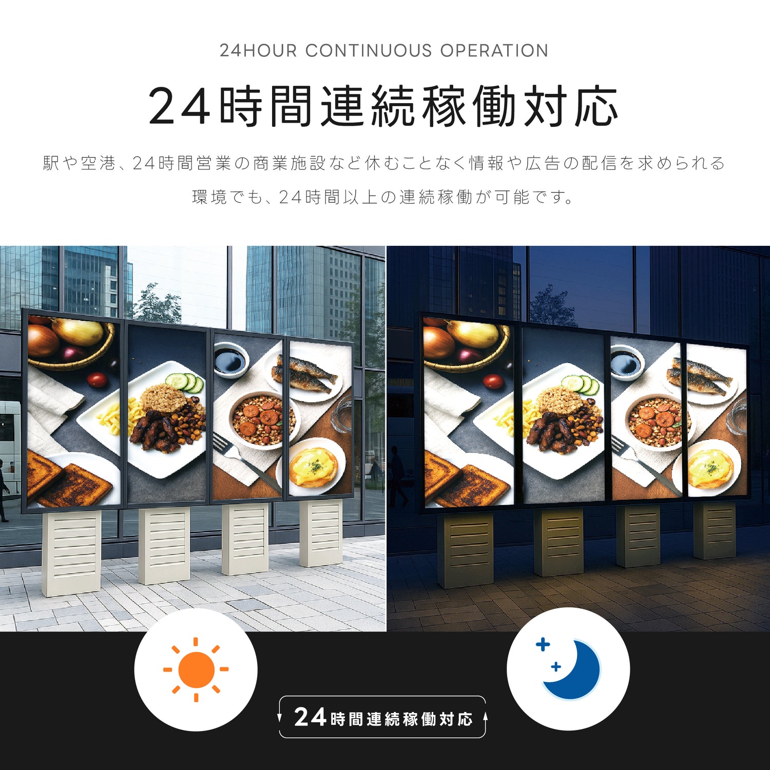 半屋外でも安心して設置できる高輝度ディスプレイ。昼間でも視認性が高く、効果的に情報を発信できます。