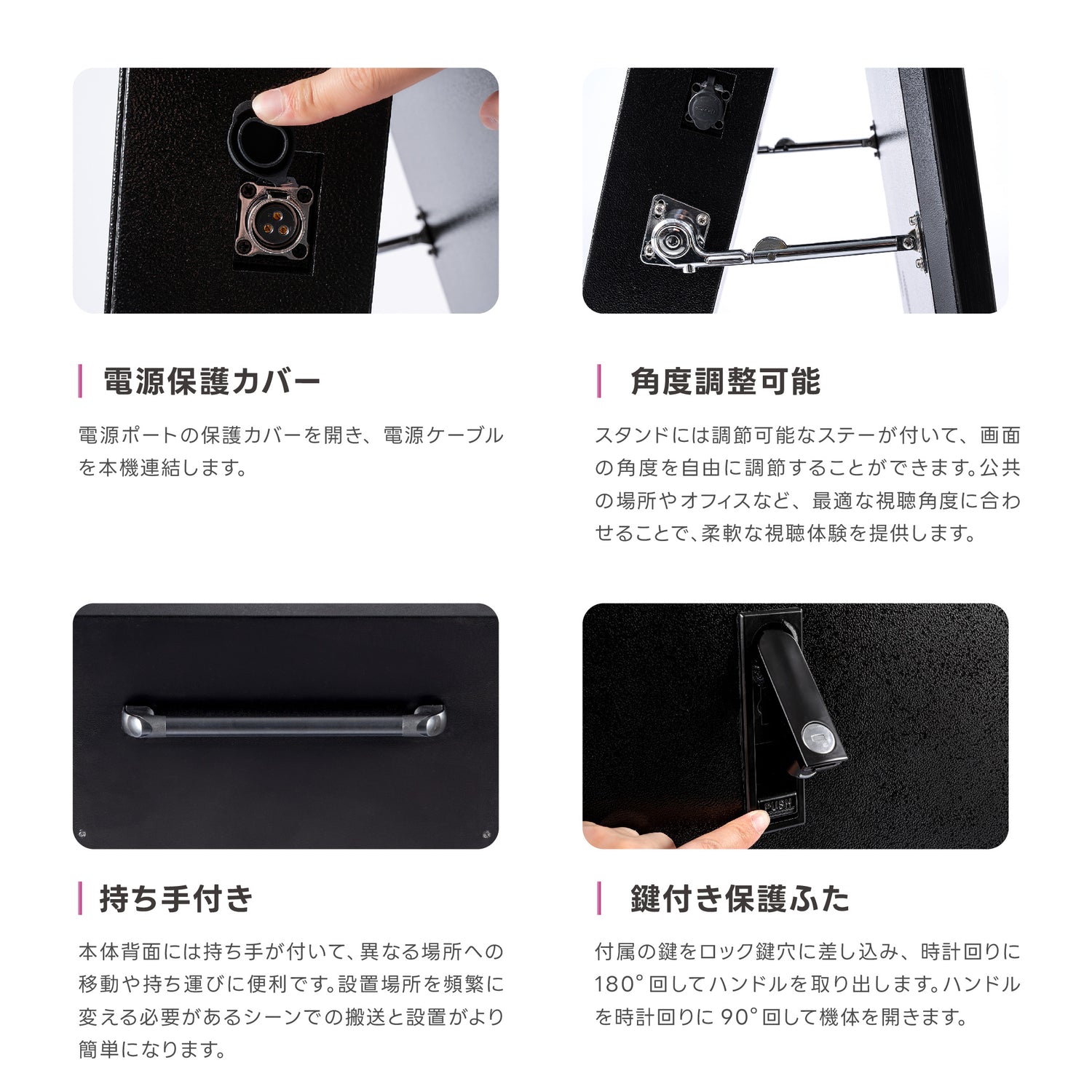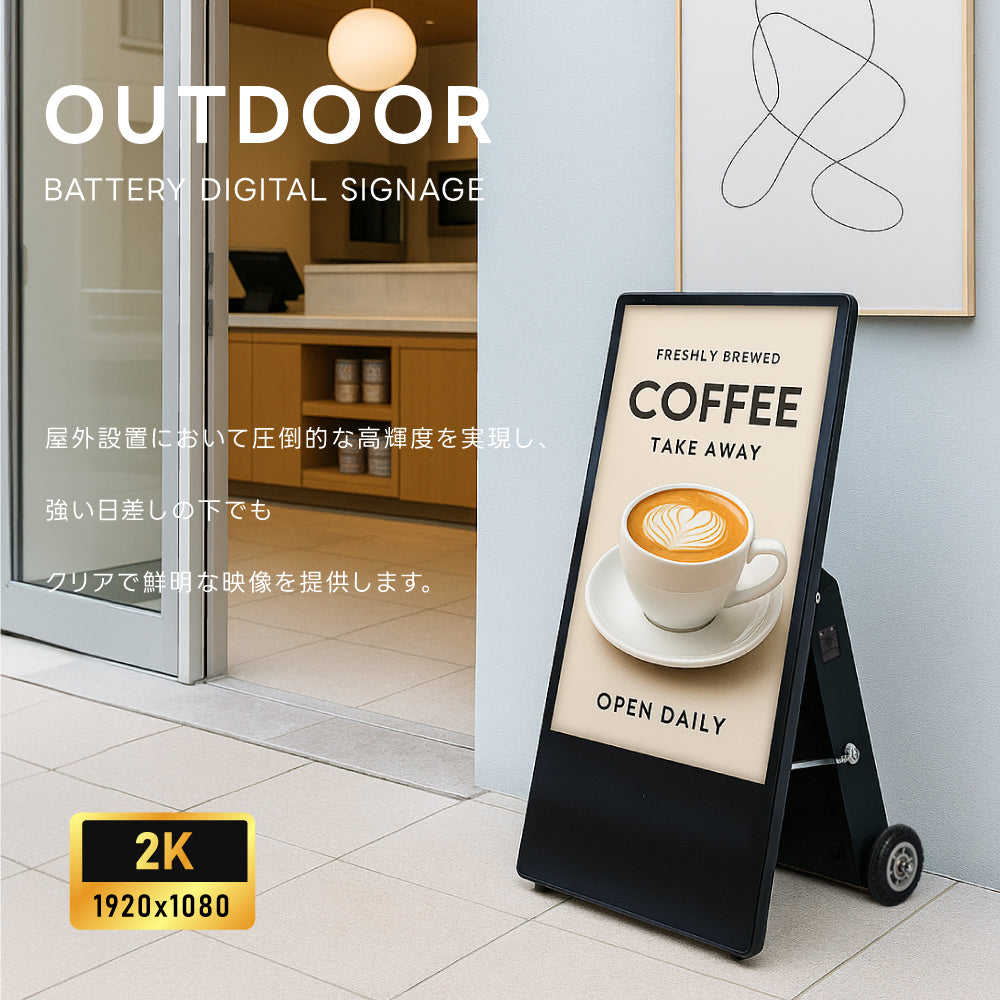 メニュー表示やイベント案内など、店舗前や施設エントランスでの案内用途に最適です。