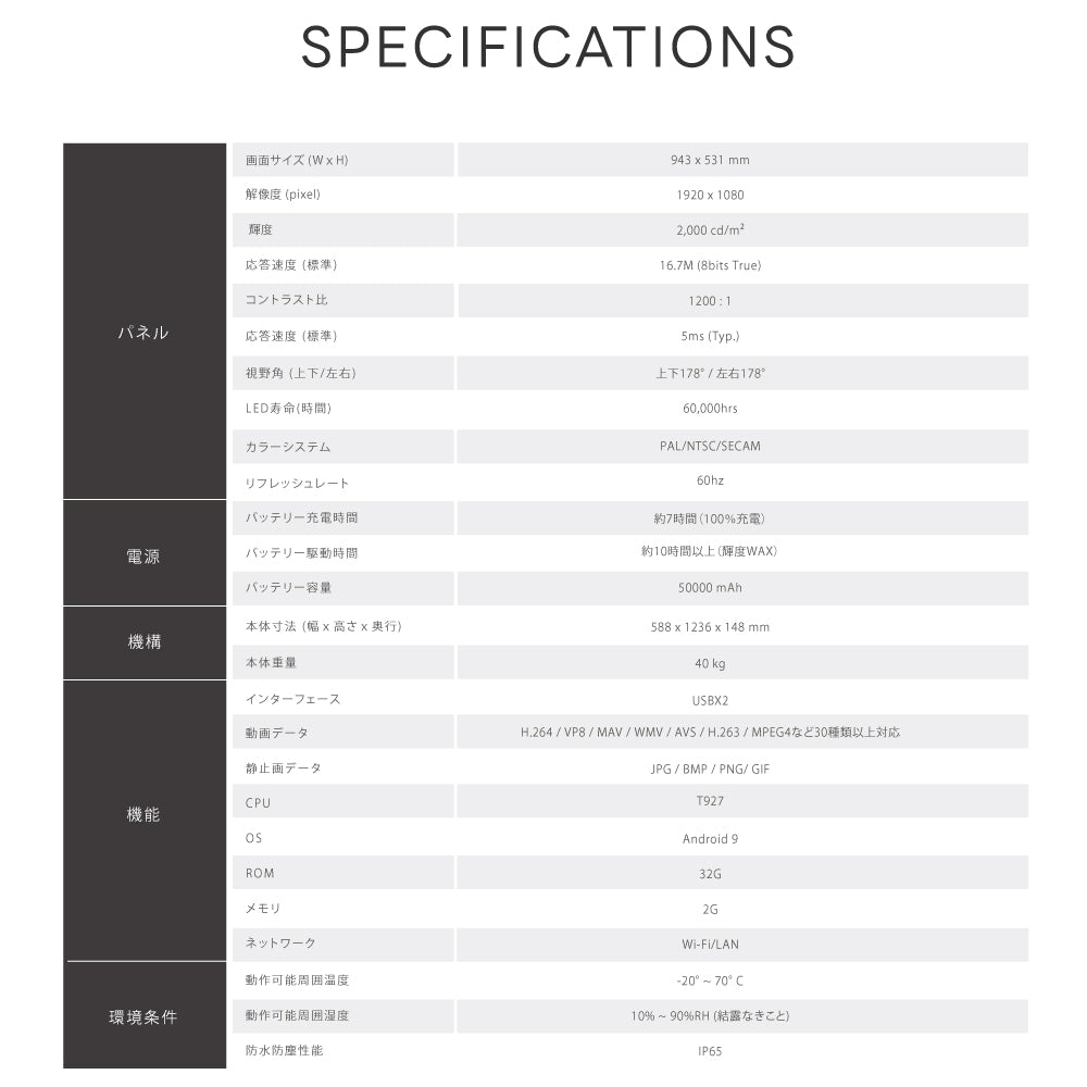 屋外仕様 デジタルサイネージ 43インチ 軽量 可動 バッテリー式 電子看板 TV-G43PO-BAT